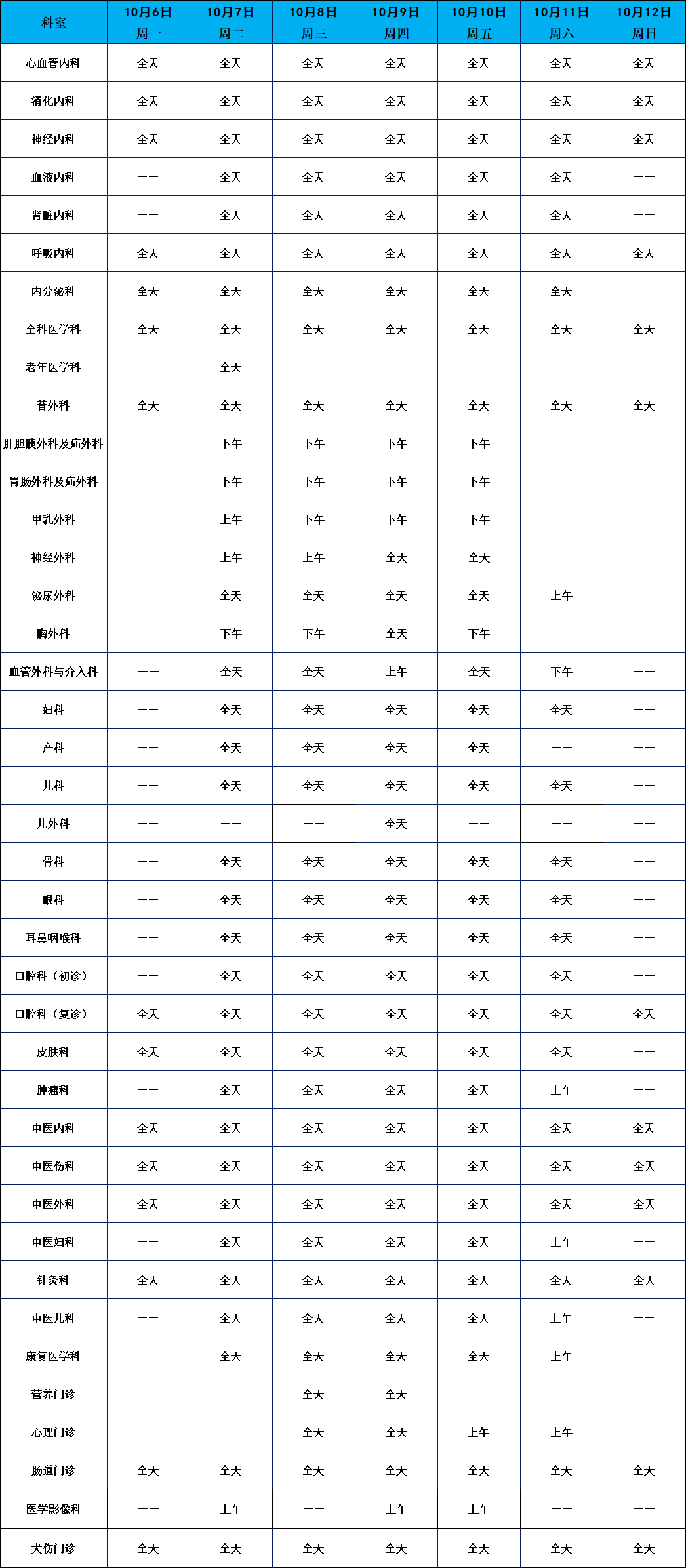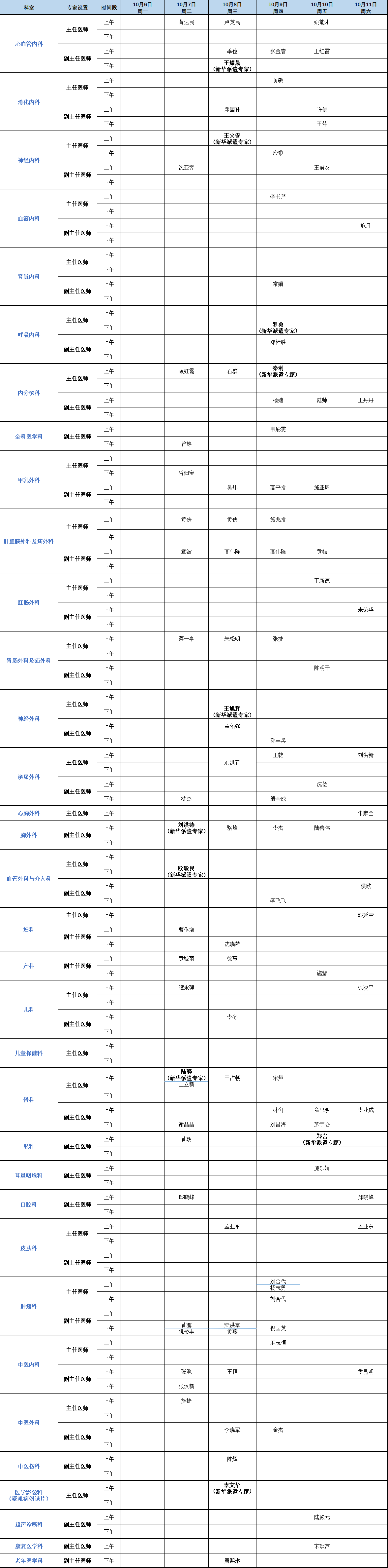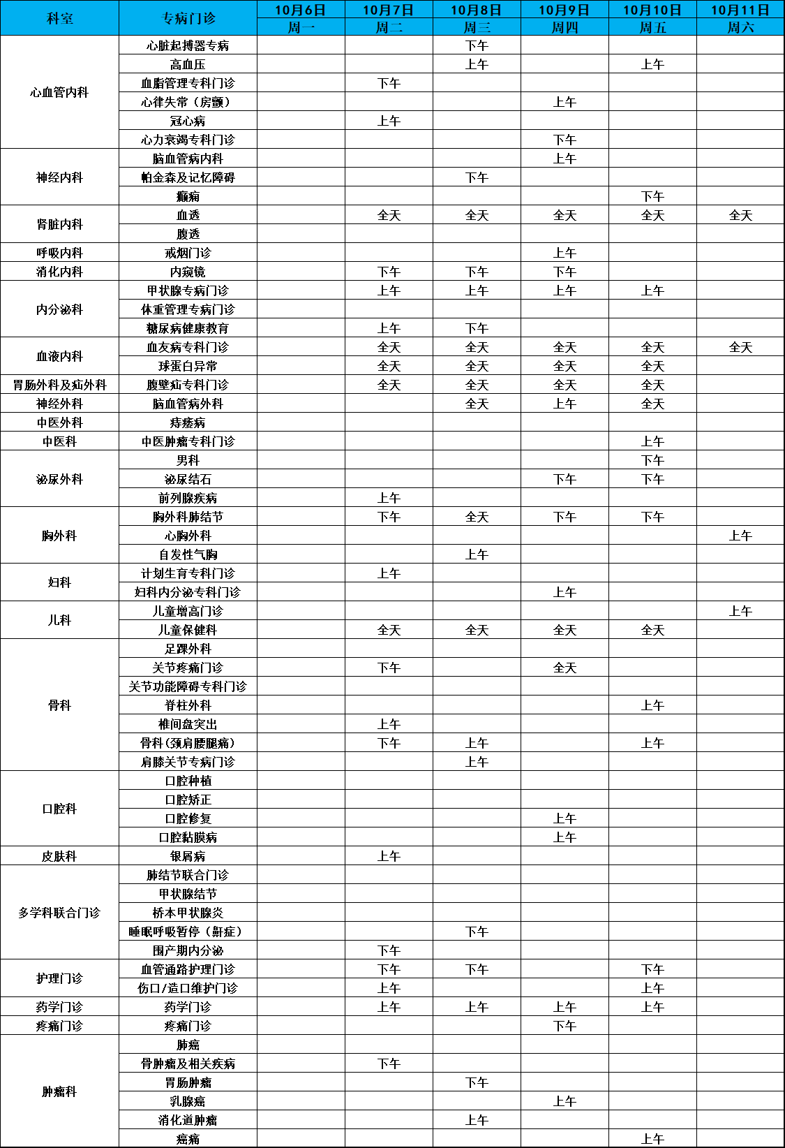 门诊安排(2025年10月6日-10月12日)