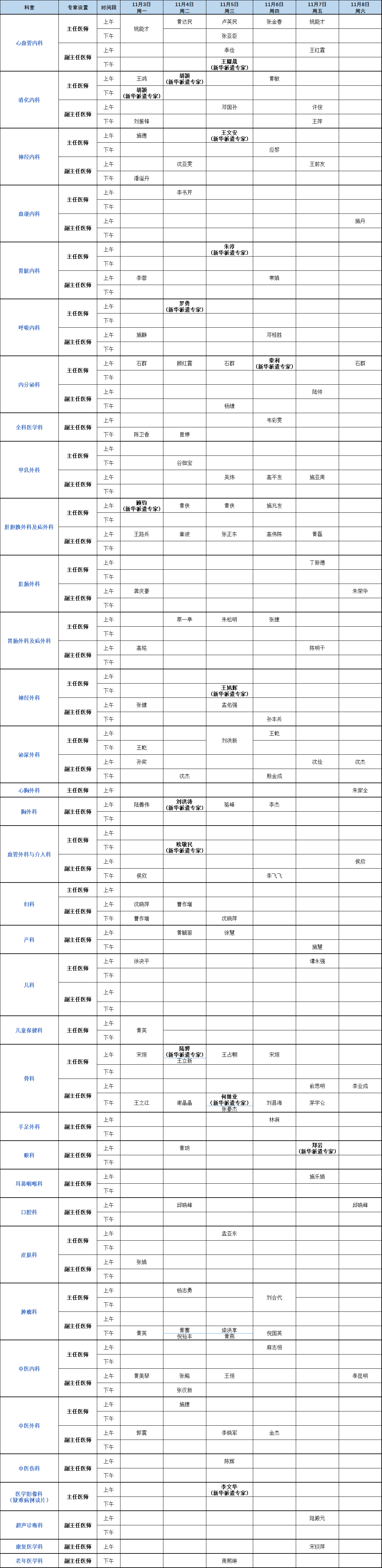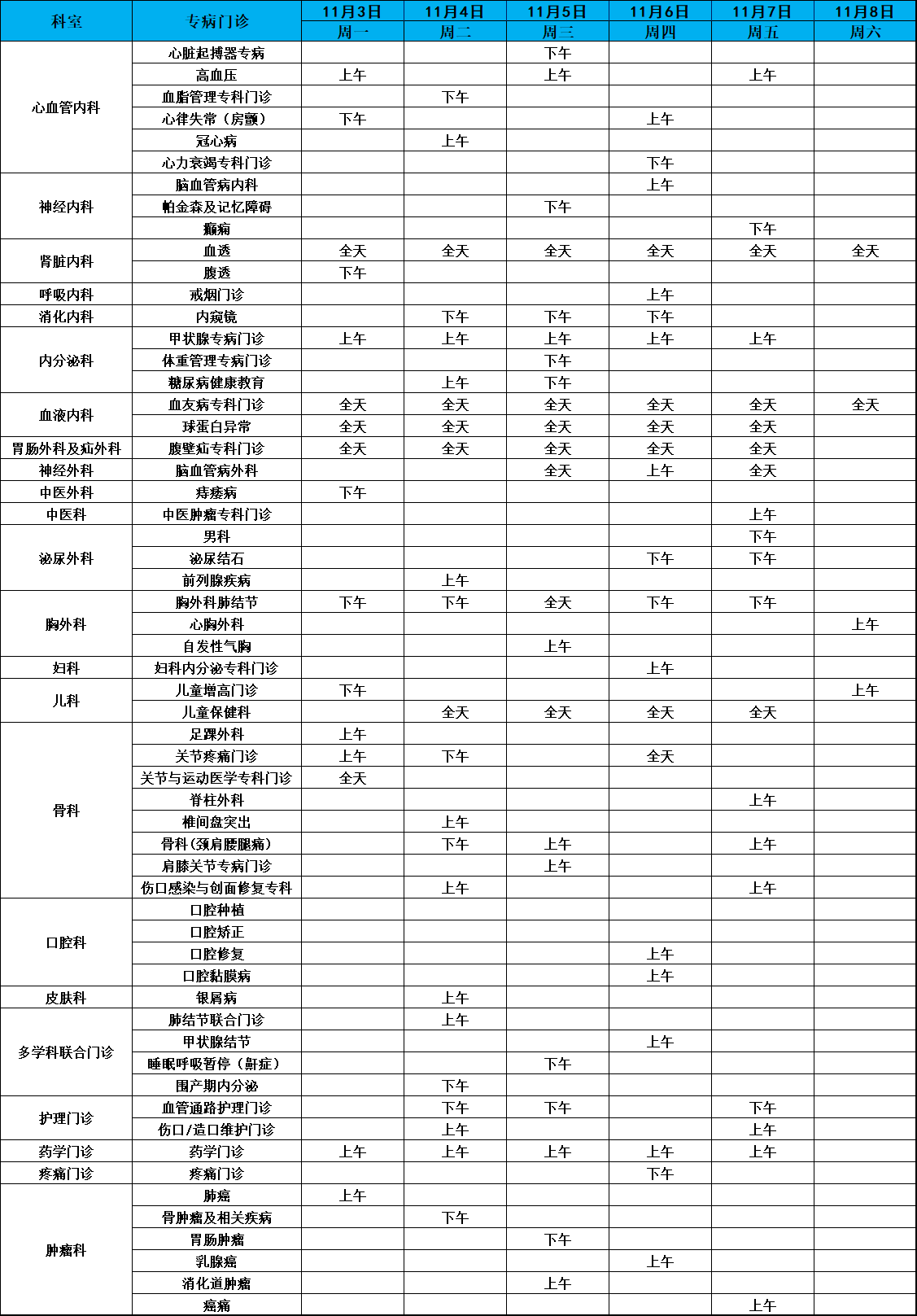 门诊安排(2025年11月3日-11月9日)