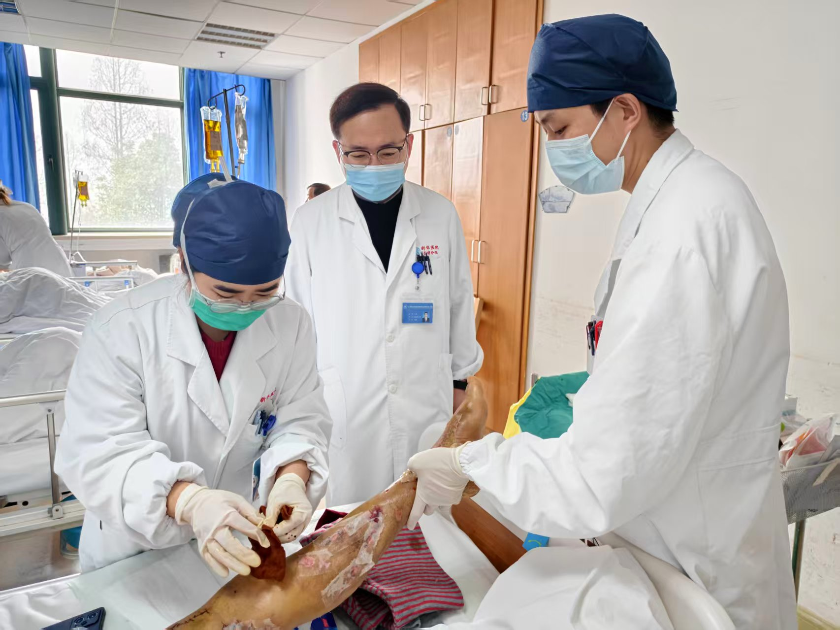 2025年8月,一场突如其来的车祸让76岁的祖老伯陷入绝境:左下小腿开放性骨折伴脱位,且患有严重的糖尿病和痛风,创面愈合能力极差。面对如此复杂的病情,党员张天浩医生接诊后紧急开启绿色通道。