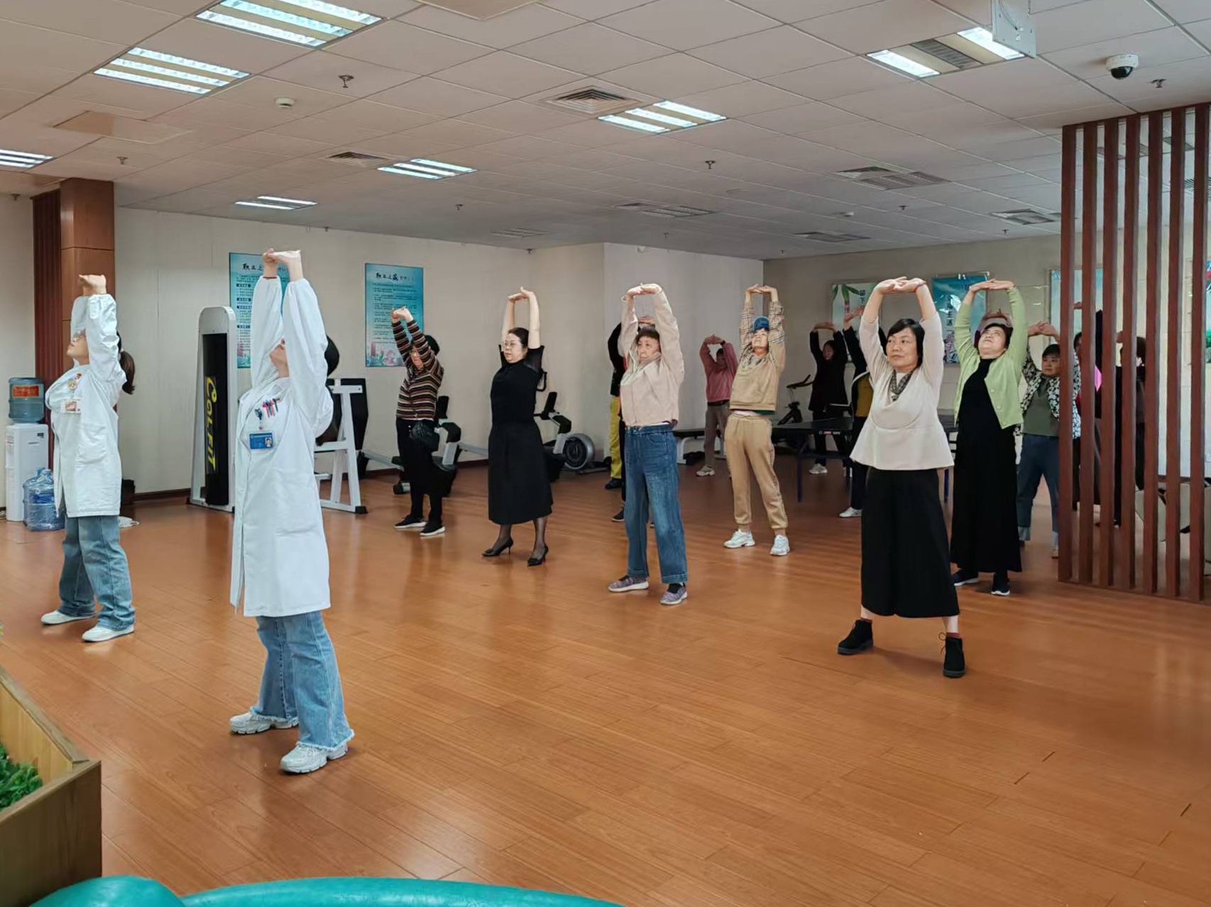 听完科普动一动,退休职工们跟着中医外科的两位医生练起了八段锦,大家沉浸在八段锦的一招一式中,悠扬的乐曲回荡在职工之家。