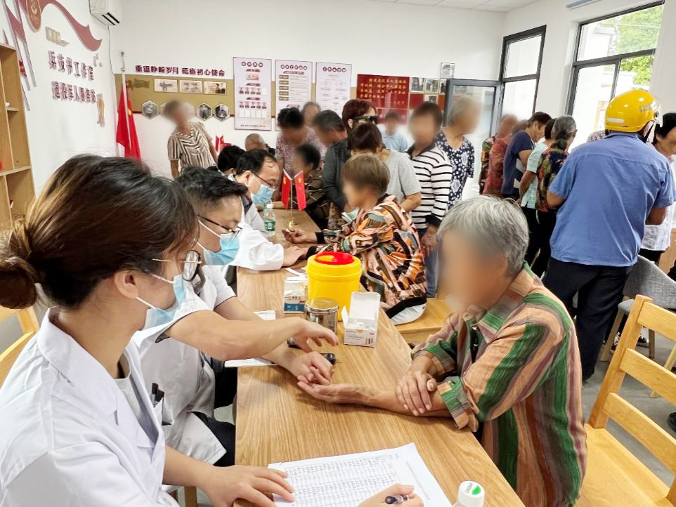 中医内外科、针灸科、妇儿科等专家医生,同新村乡社区卫生服务中心的医护人员为居民进行健康义诊,同时提供测血糖、血压服务。中医师们现场进行望闻问切,为每位前来咨询的居民进行中医辨证,并进行饮食、情志、运动等方面的健康保健指导。